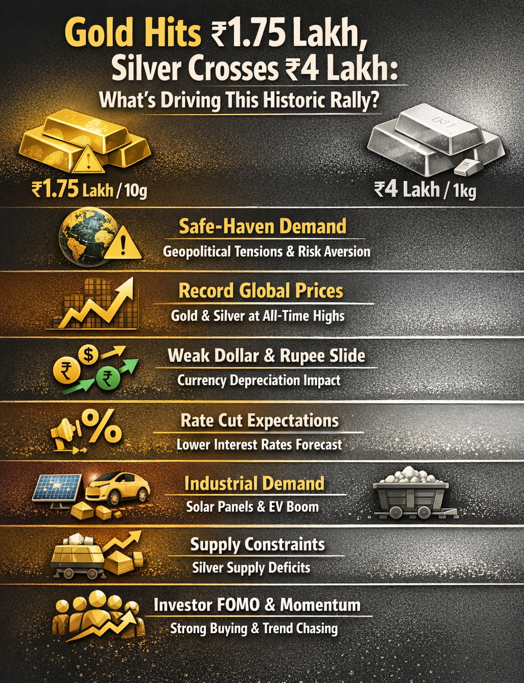 The Numbers Behind the Rally The numbers are staggering. Gold has gained more than 27% so far this year, following a massive 64% jump in 2025. Silver has performed even better, soaring over 60% in just the first month of 2026. On Wednesday, gold futures on the Multi-Commodity Exchange (MCX) jumped ₹4,800 in a single day to reach ₹1,62,429 per 10 grams. Silver futures shot up by ₹21,400 to hit ₹3,77,655 per kilogram. The very next day, silver smashed through the ₹4 lakh barrier for the first time in history. Why Are Prices Skyrocketing?