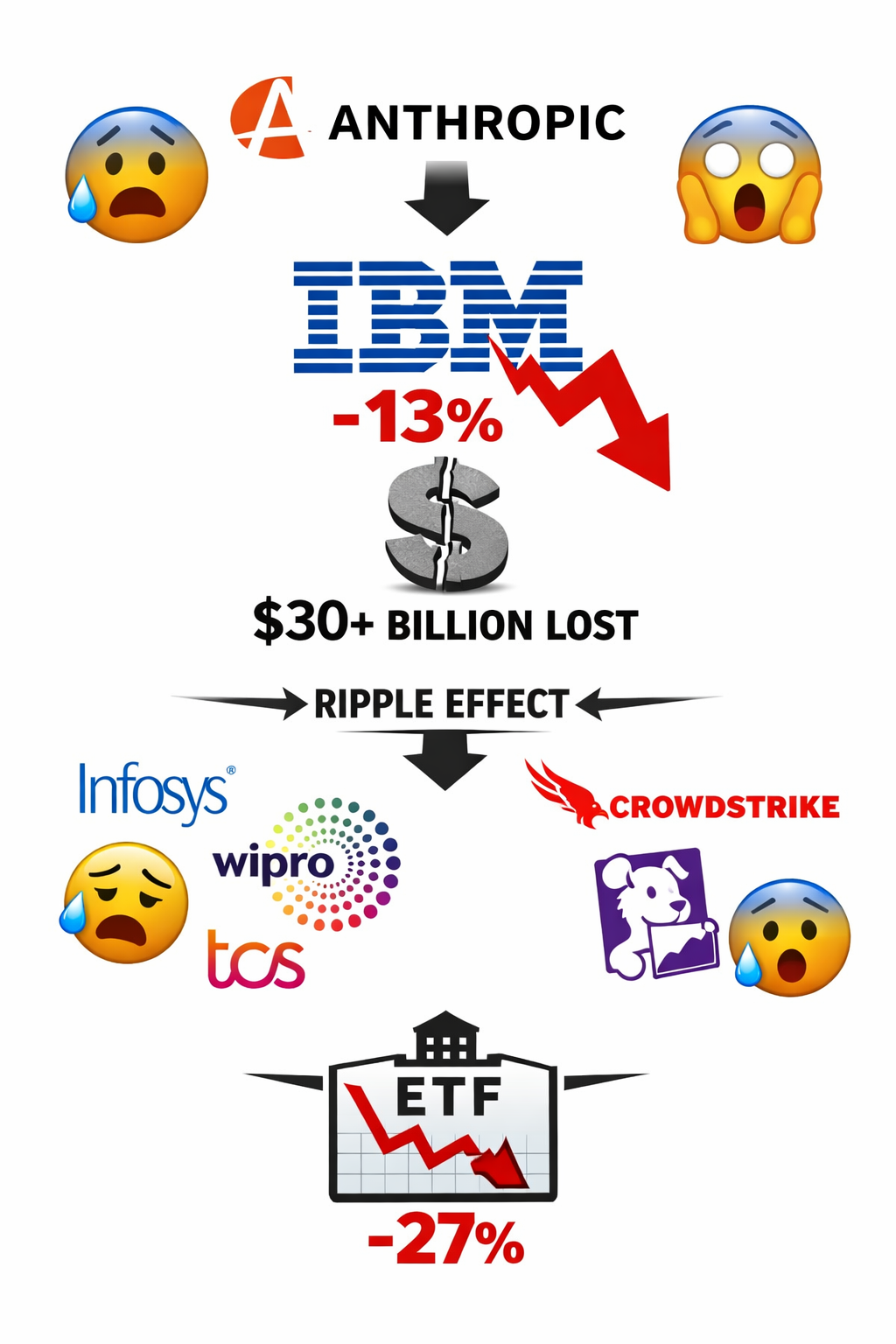 IBM wasn't alone. The sell-off spread quickly to other parts of the tech and IT sector. Indian IT giants like Infosys, Wipro, and TCS also felt the pressure. A significant part of their business involves helping large companies manage and update legacy systems - including COBOL. If AI reduces the need for that work, their revenue models face similar questions. Cybersecurity companies like CrowdStrike and Datadog also saw their stocks dip after Anthropic separately revealed that Claude Code includes security scanning features. Investors started asking the same question across the board: if AI can do this work, who still needs to pay someone else to do it? A major software ETF has now dropped about 27% this year - its steepest quarterly fall since the 2008 financial crisis.