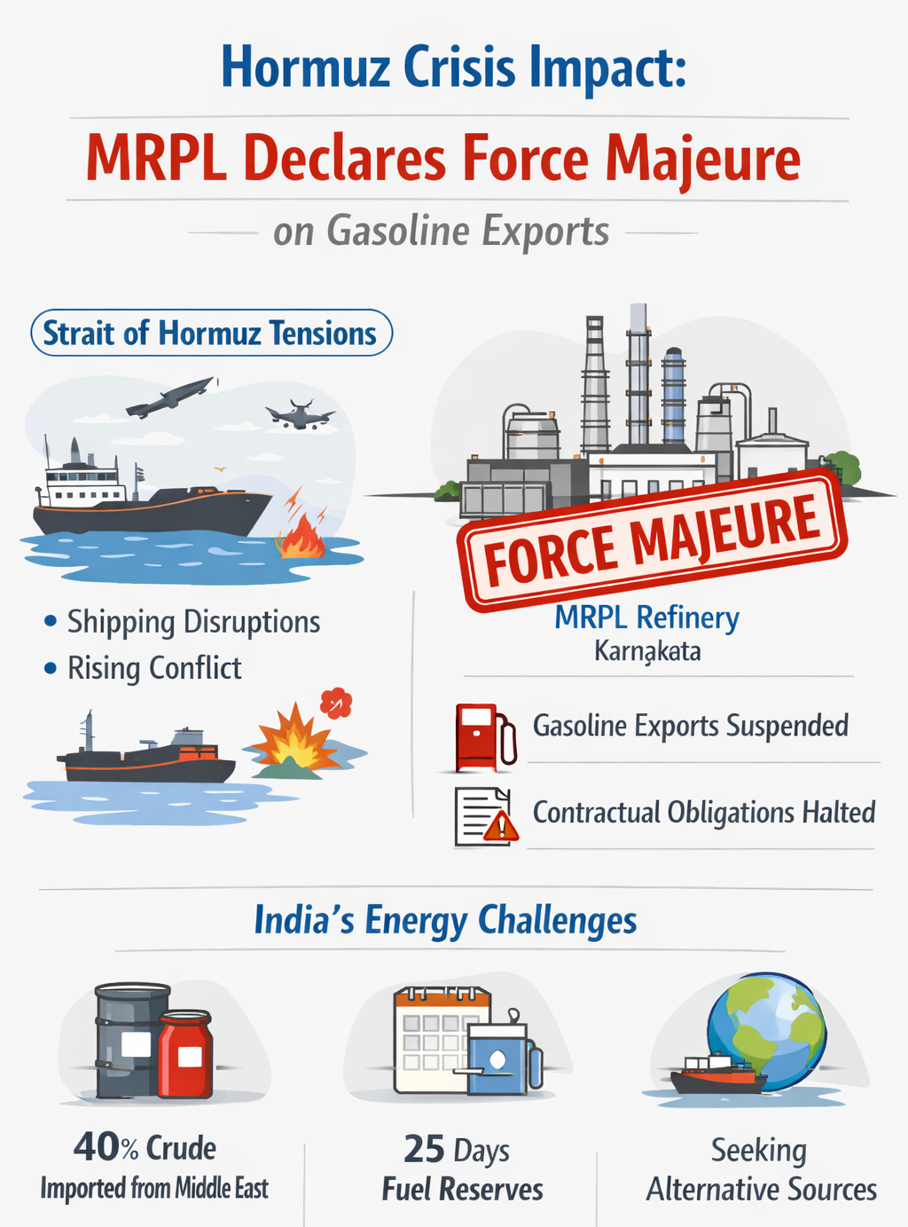 A refinery the size of a small city sits on the coast of Karnataka. Every day, it processes half a million barrels of crude oil and ships fuel to buyers across the world. This week, it stopped. Not because of a breakdown or a strike - but because a waterway thousands of kilometres away has effectively closed. Mangalore Refinery and Petrochemicals Limited, known as MRPL, declared force majeure on March 4. The legal move means the company is formally suspending its commitments to deliver gasoline shipments for March and April, citing circumstances it cannot control. Those circumstances have a name: the Strait of Hormuz.